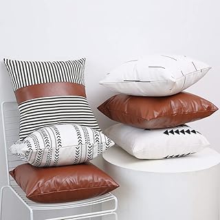 Kiuree ボーホー スローピローカバー 6枚セット 厚手 コットンリネン モダン マッドクロス ファームハウス デコレーション ストライプ フェイクレザー 枕カバー 18x18インチ カウチソファ用