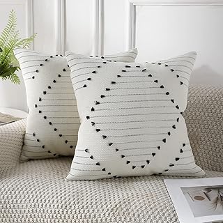 famibay 2パック 手織り ボーホー スロー枕カバー 装飾的 正方形 コットン 屋内 屋外 枕カバー 18 x 18インチ - ニュートラル ファームハウス 枕カバー ソファ 寝室用 (リネンとブラック)