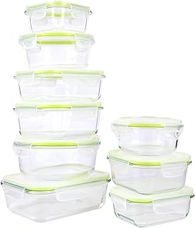 GLASSWELL ガラス製食品保存容器 9個パック ロック蓋付き 密閉&漏れ防止 BPAフリー 食洗機/オーブン、冷凍庫/電子レンジ対応