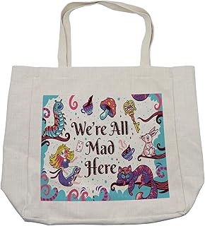 Ambesonne 不思議の国のアリス ショッピングバッグ 「We Are All Mad Here Words Caterpillar ホワイトウサギ チェシャ猫 エコフレンドリー 再利用可能なバッグ 食料雑貨 ビーチなどに 15.5インチ X 14.5インチ クリーム